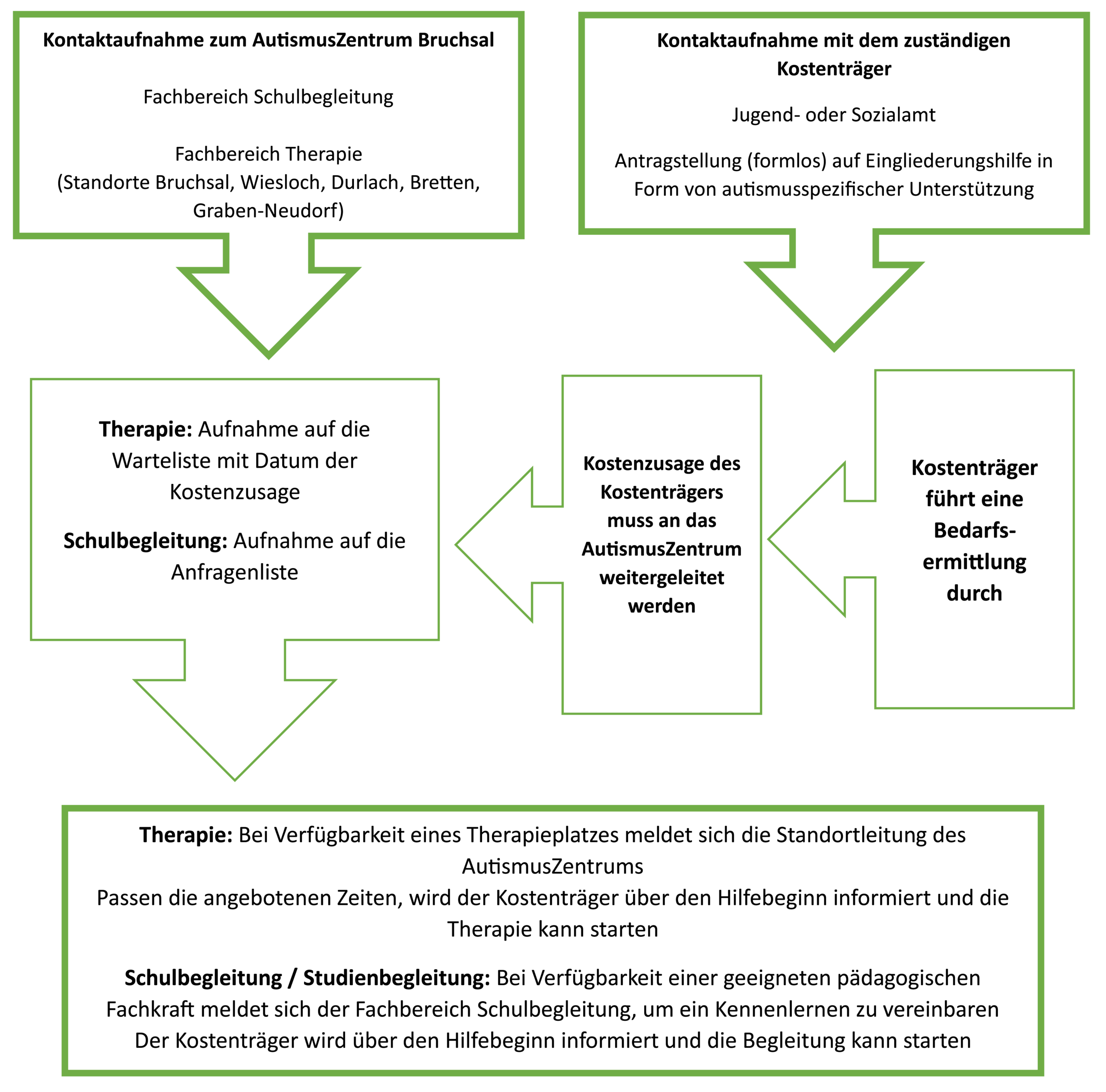 Um die Leistungen in Anspruch nehmen zu können, ist ein Antrag beim zuständigen Kostenträger erforderlich. Dieser wird von der betroffenen Person selbst oder – bei Kindern – von den Erziehungsberechtigten gestellt. Nach der Bedarfsermittlung und einer entsprechenden Kostenzusage durch den Kostenträger kann eine Aufnahme auf die Warteliste für die Therapie oder auf die Anfragenliste für die Schul- bzw. Studienbegleitung erfolgen.